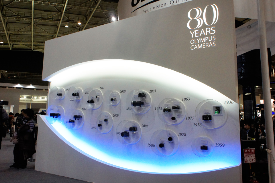80周年を記念した歴代カメラの展示スペースがあります。オリンパスファンにはたまらない、歴代モデルがきれいに飾られています。